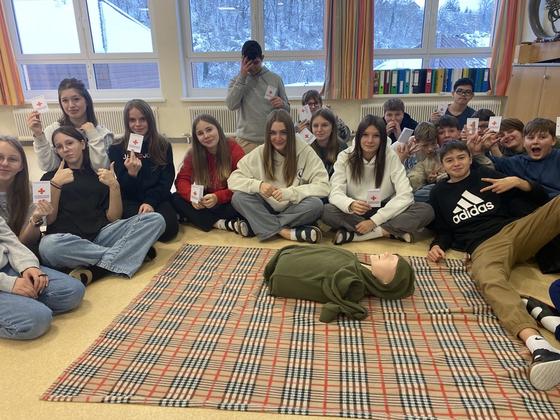 Hierfür blieben die Schülerinnen und Schüler freiwillig an 5 Freitagnachmittagen in der Schule, um zu üben und die Erste-Hilfe-Maßnahmen zu lernen.