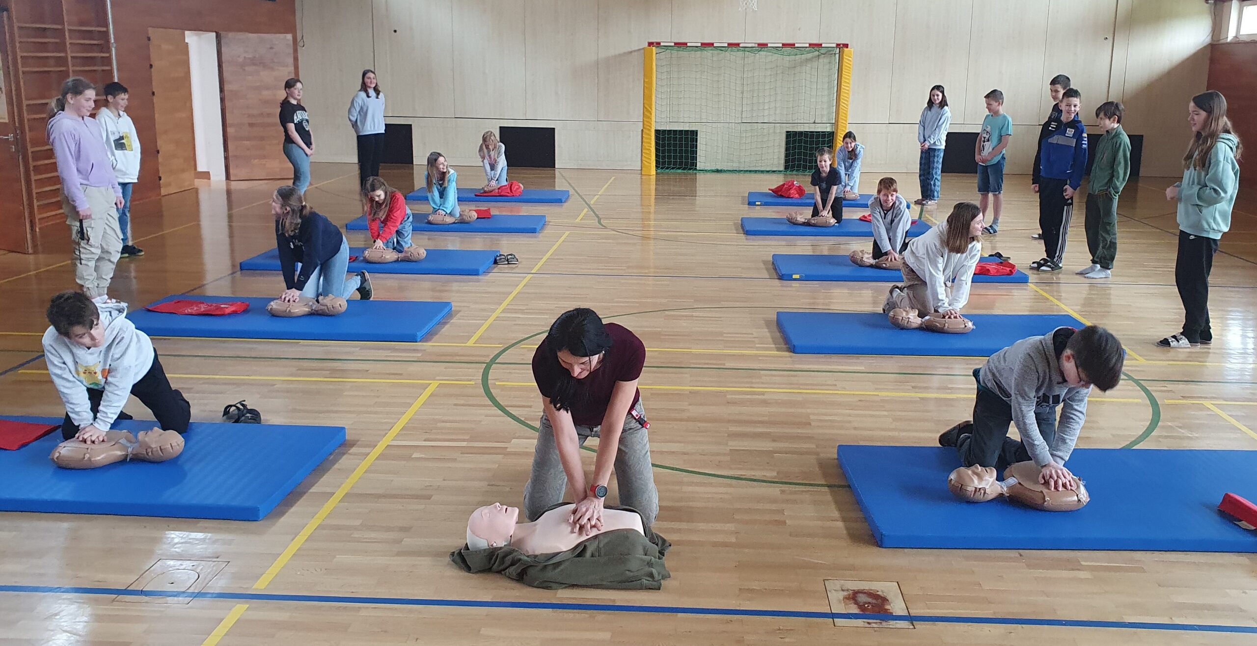 Um die Wiederbelebung bestmöglich trainieren zu können, sponserte der Elternverein der Mittelschule dankenswerterweise 10 Wiederbelebungspuppen, an denen die Schülerinnen und Schüler nun fleißig unter der Anleitung von unserer Erste-Hilfe-Lehrbeauftragten Heidemarie Praschak-Steininger die Herzdruckmassage üben.