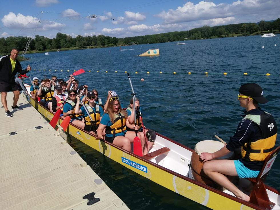 Die gesamte Schulgemeinschaft, Kinder und alle Lehrkräfte waren beim Event „Klasse im Boot“ dem Drachenbootrennen am Ausee in Asten fleißig vertreten.