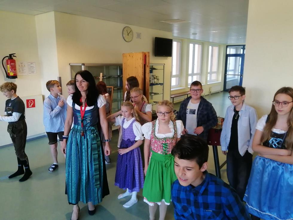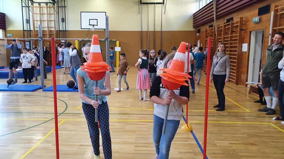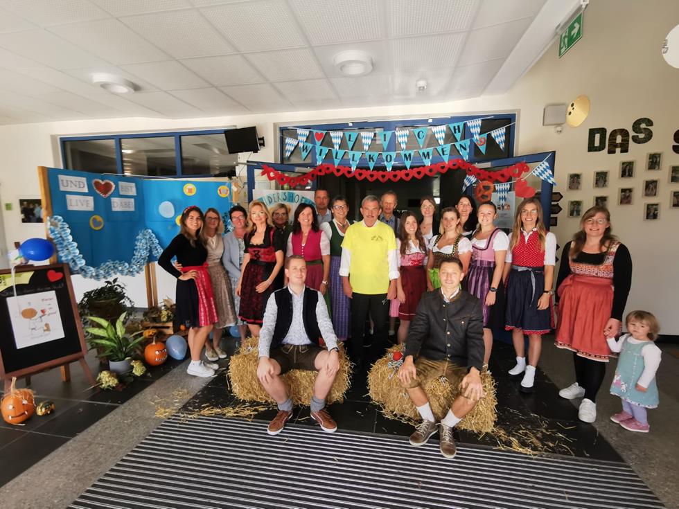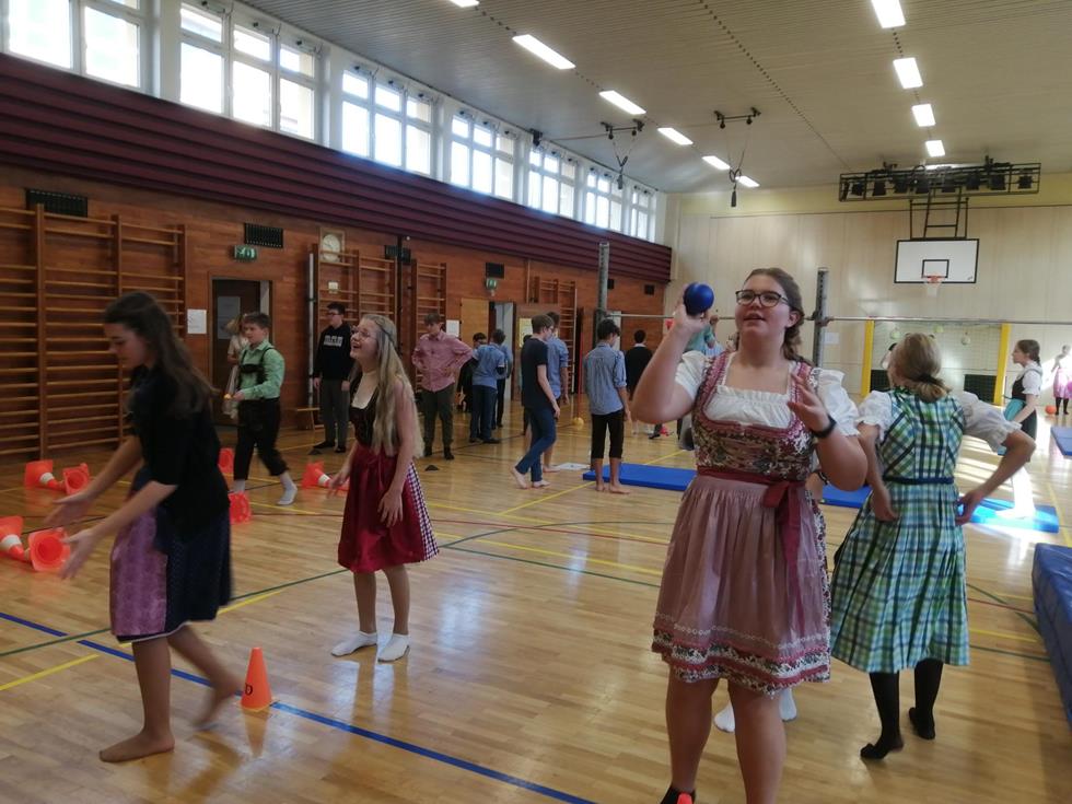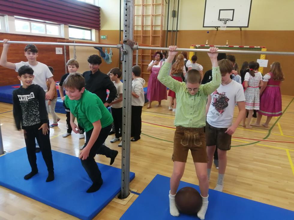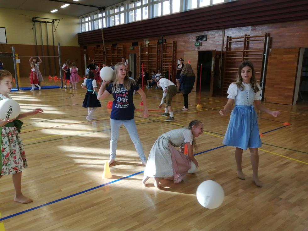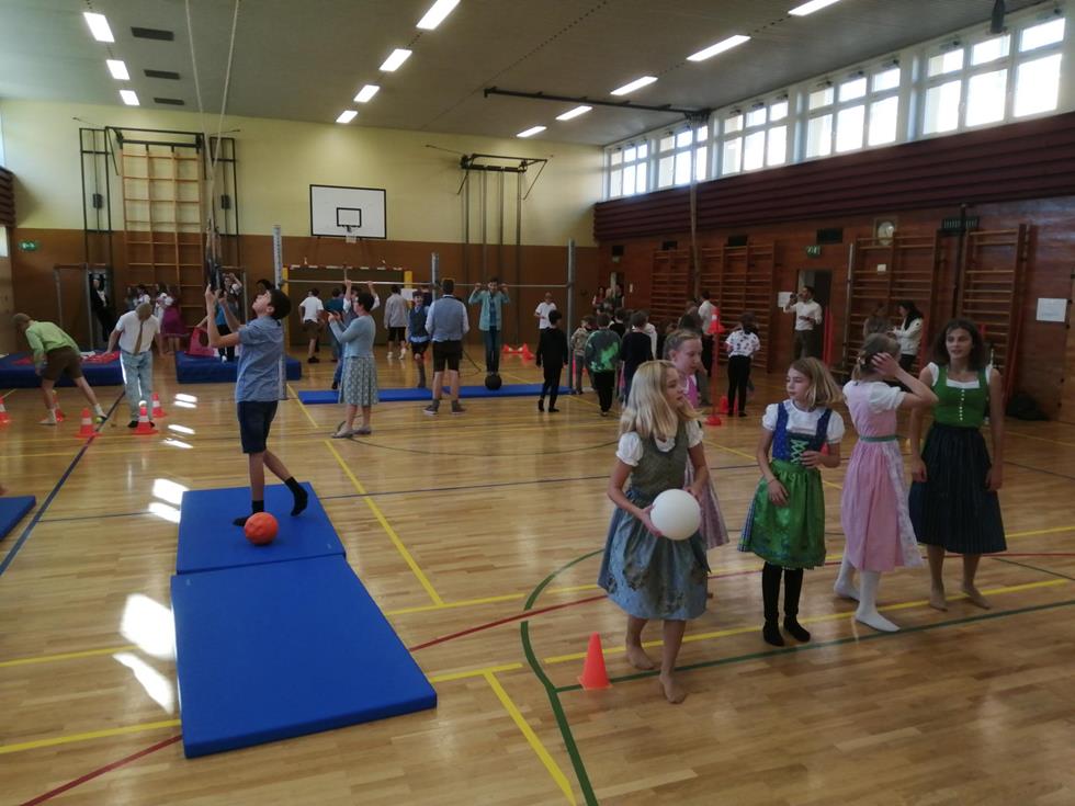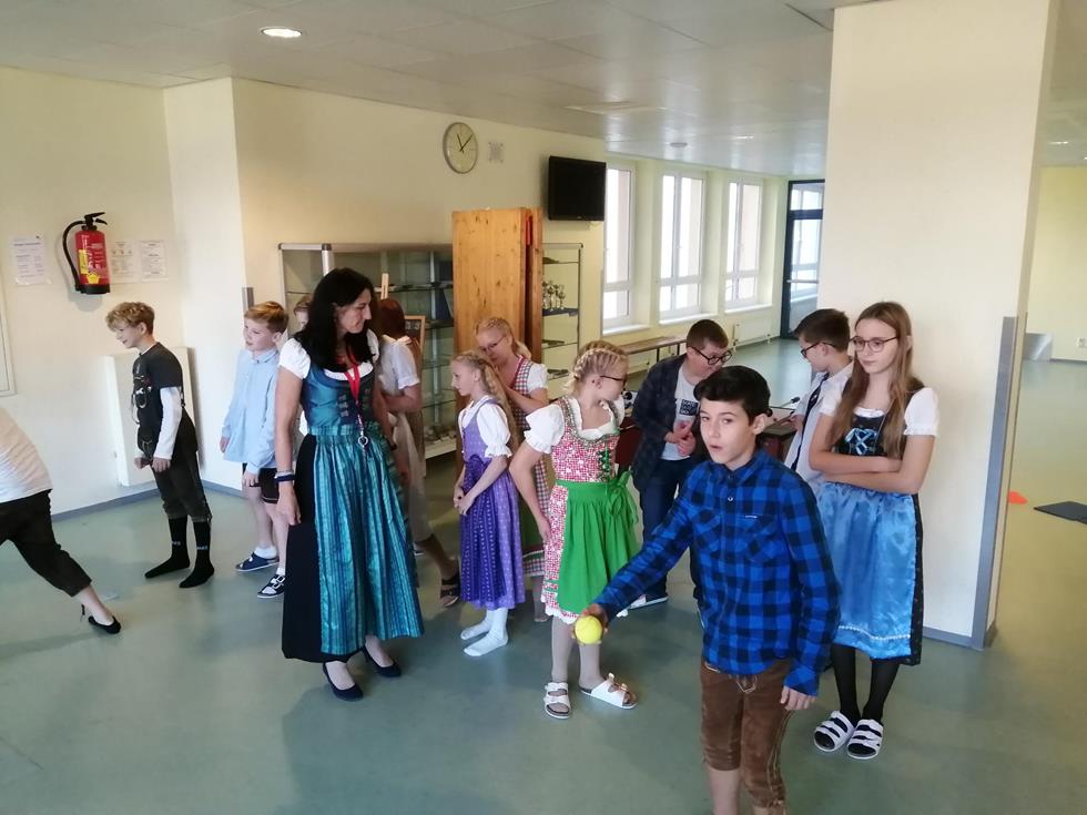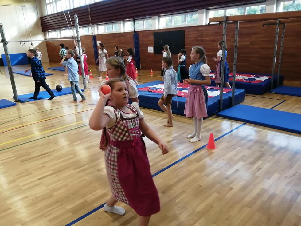 Eini ins Dirndl und in die Lederhose und ab in die Schule. Im Schulhaus erklang zünftige Musik, gespielt von 3 SchülerInnen auf der Steirischen. Zur Jause wurden Brezln geteilt und im gesamten Schulgebäude luden tolle Spielstationen zum Spaß haben und Lachen ein.