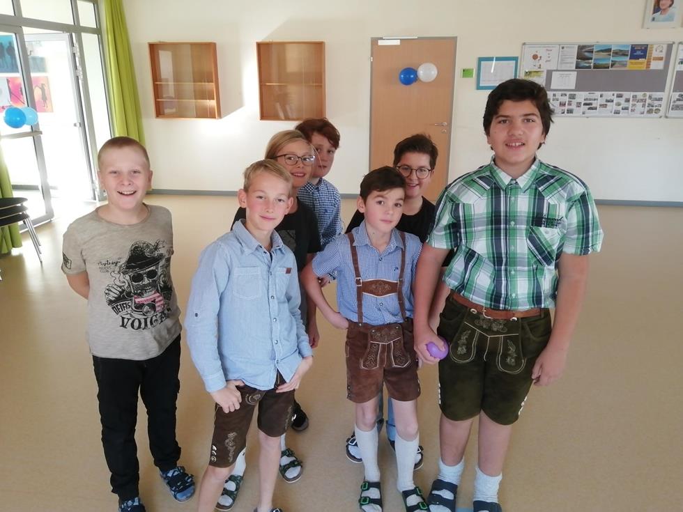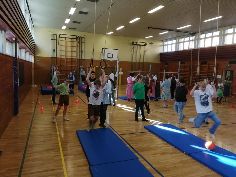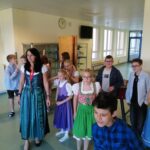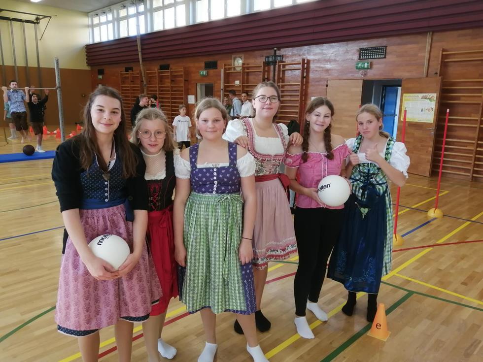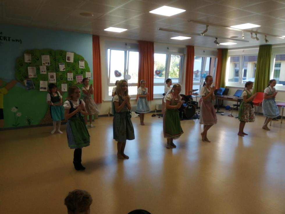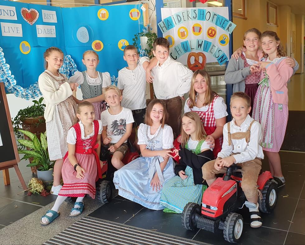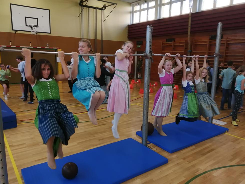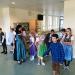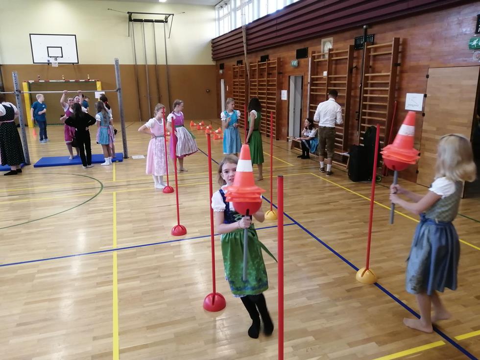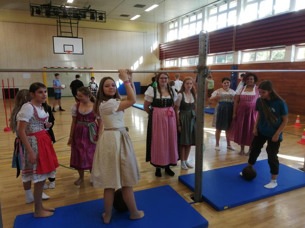 Eini ins Dirndl und in die Lederhose und ab in die Schule. Im Schulhaus erklang zünftige Musik, gespielt von 3 SchülerInnen auf der Steirischen. Zur Jause wurden Brezln geteilt und im gesamten Schulgebäude luden tolle Spielstationen zum Spaß haben und Lachen ein.