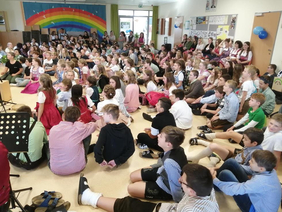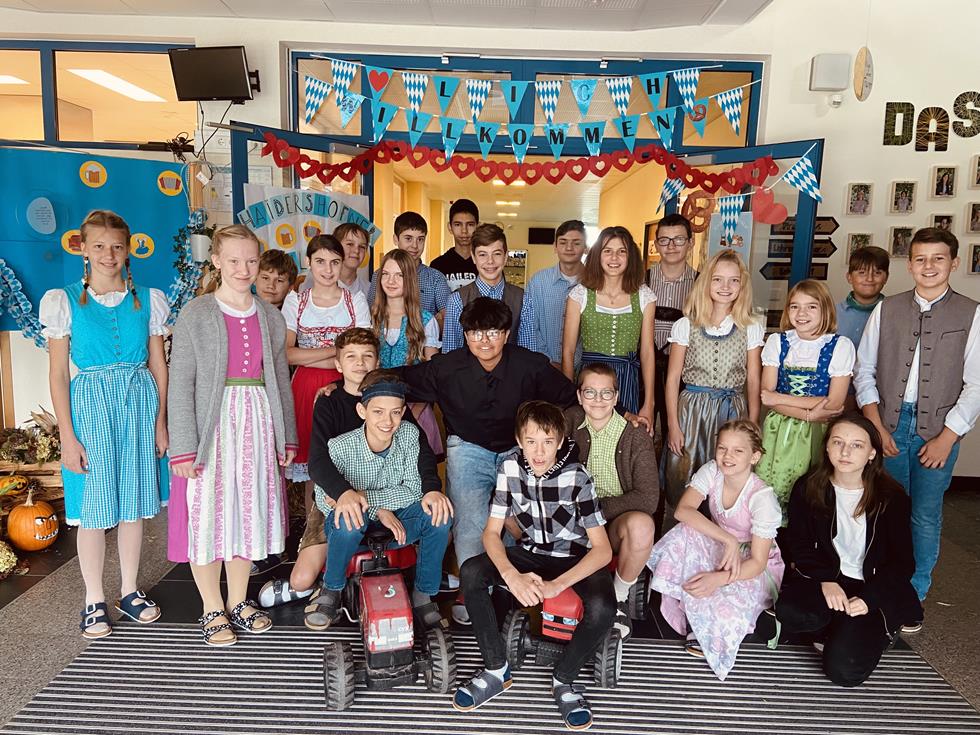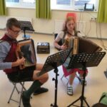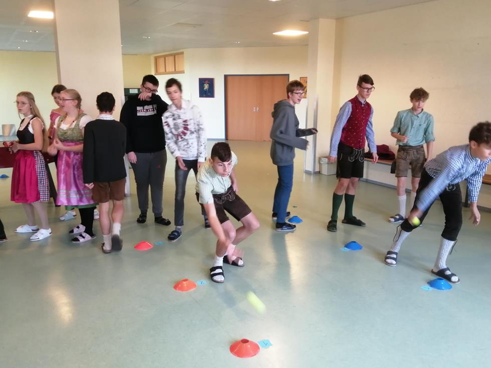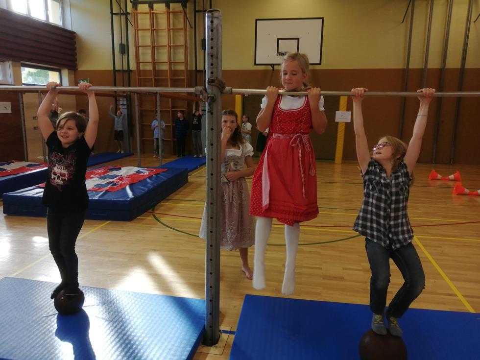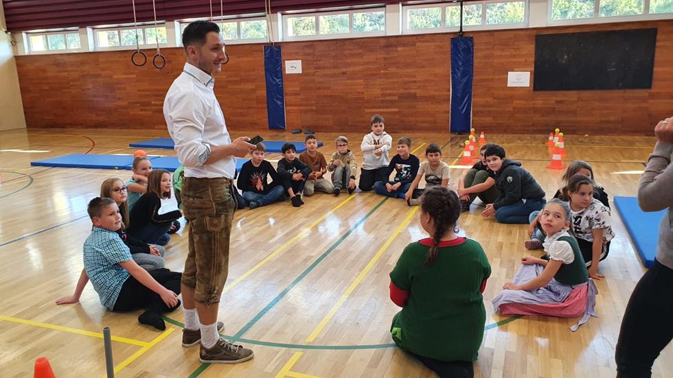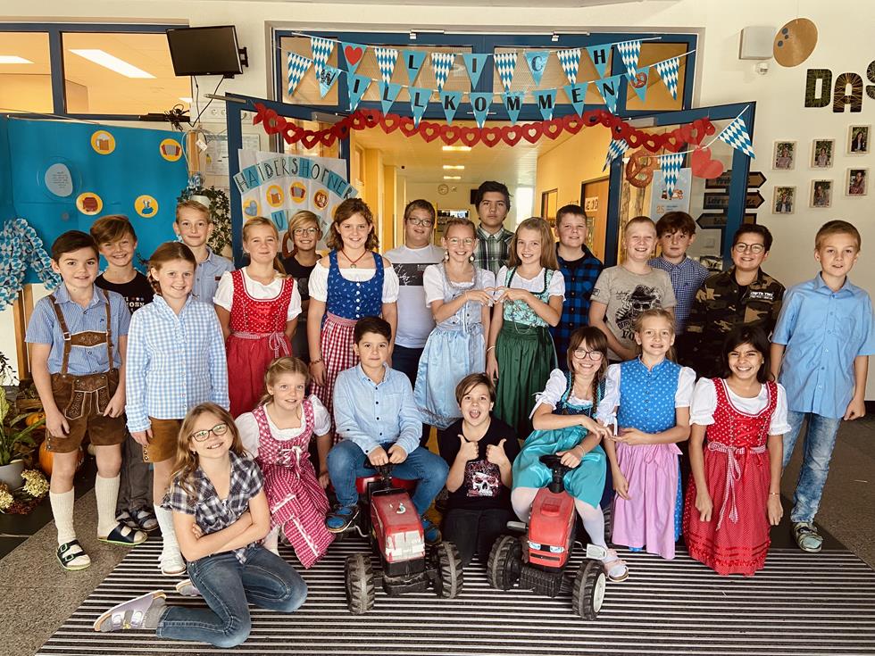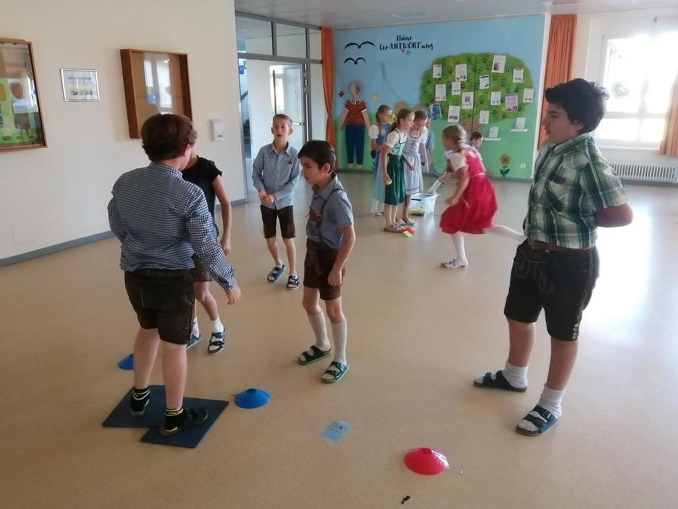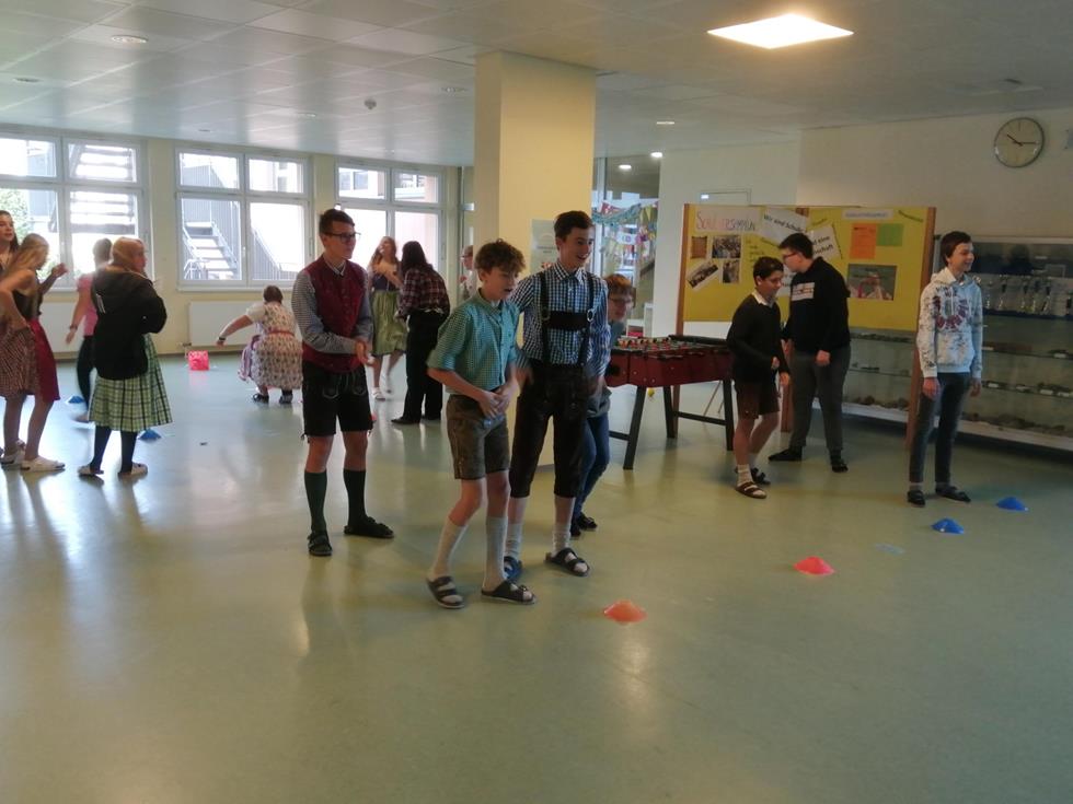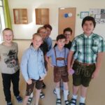 Eini ins Dirndl und in die Lederhose und ab in die Schule. Im Schulhaus erklang zünftige Musik, gespielt von 3 SchülerInnen auf der Steirischen. Zur Jause wurden Brezln geteilt und im gesamten Schulgebäude luden tolle Spielstationen zum Spaß haben und Lachen ein.