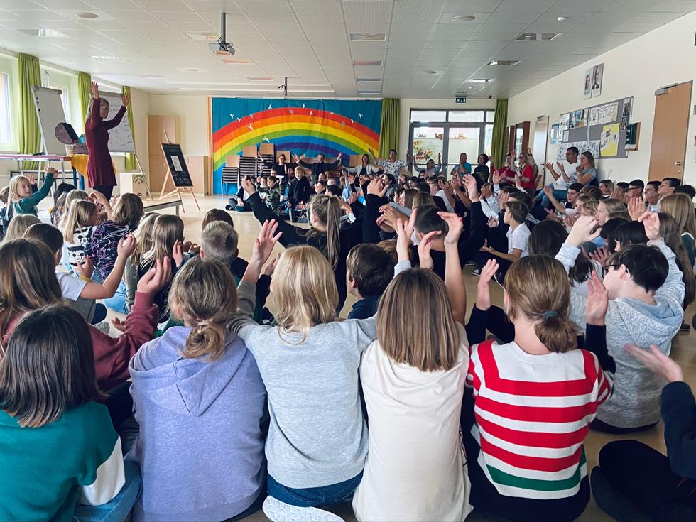Was braucht es für ein harmonisches Schulklima? Wann fühle ich mich wohl in der Schule? Wie soll eine lebendige Schule aussehen? Welchen Beitrag kann ich für ein besseres Miteinander und eine saubere Umwelt leisten? All diese Themen beschäftigten uns bei der ersten Schulversammlung und bei den Antworten waren sich die Schülerinnen und Schüler schnell einig: Eine gute Schulgemeinschaft braucht Vertrauen, Respekt, Wertschätzung und Toleranz. Der achtsame, ehrliche und rücksichtsvolle Umgang mit sich selbst, mit den Mitmenschen, aber auch mit der Umwelt, soll für ein gutes Schulklima sorgen. Denn nur in einer guten Lernumgebung können wir unserem Leitbild entsprechend "voneinander lernen, miteinander arbeiten, füreinander leben." (Peter Petersen)