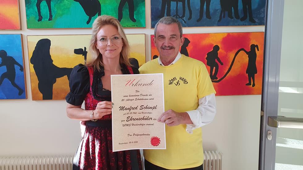 Zum Abschluss wurde in einem würdigen Rahmen, unser langjähriger Bürgermeister und Obmann der Schulgemeinde Herr Manfred Schimpl verabschiedet. Neben der Ernennung zum Ehrenschüler der NÖMS Haidershofen, durfte ihm eine Schülerin auch ein selbstgezeichnetes Porträt überreichen.